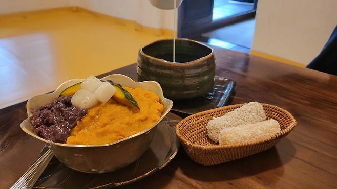Shaved ice with sweet pumpkin and injeolmi, a type of Korean traditional rice cake, are the favorites at this teahouse. It features a front yard and a study where the Guinhoe collection and relevant archives are on display.