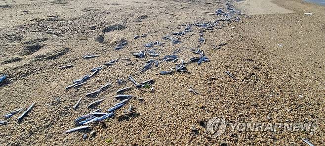 (강원 고성=연합뉴스) 이종건 기자 = 11일 강원 고성군의 한 해변 백장에 파도에 밀려 나온 멸치들이 널려 있다. 이들 멸치는 이날 오전에 백사장으로 밀려 나와 주민과 관광객들이 주워가기도 했다. 동해안에서는 멸치 떼가 백사장으로 밀려 나오는 일이 가끔 발생하고 있다. 주민들은 멸치가 큰 고기에게 쫓기다가 파도에 밀려 해변으로 나오는 것으로 보고 있다. 2021.9.11