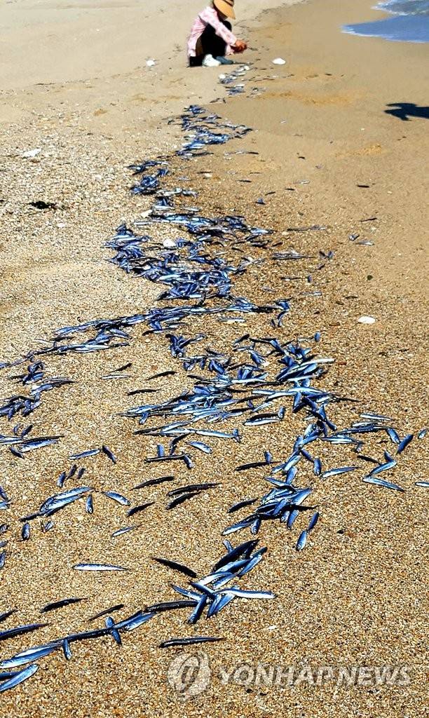(강원 고성=연합뉴스) 11일 강원 고성군의 한 해변 백사장에 파도에 밀려 나온 멸치들이 널려 있다. 이들 멸치는 이날 오전에 백사장으로 밀려 나와 주민과 관광객들이 주워가기도 했다. 동해안에서는 멸치 떼가 백사장으로 밀려 나오는 일이 가끔 발생하고 있다. 주민들은 멸치가 큰 고기에게 쫓기다가 파도에 밀려 해변으로 나오는 것으로 보고 있다. 2021.9.11