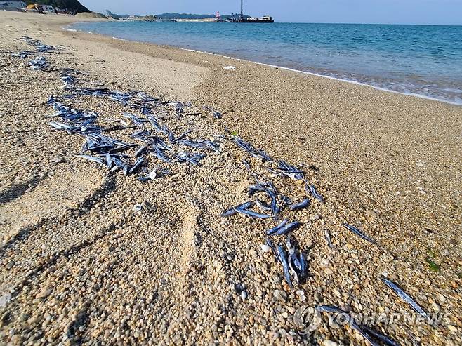 (강원 고성=연합뉴스) 이종건 기자 = 11일 강원 고성군의 한 해변 백사장에 파도에 밀려 나온 멸치들이 널려 있다. 이들 멸치는 이날 오전에 백사장으로 밀려 나와 주민과 관광객들이 주워가기도 했다. 동해안에서는 멸치 떼가 백사장으로 밀려 나오는 일이 가끔 발생하고 있다. 주민들은 멸치가 큰 고기에게 쫓기다가 파도에 밀려 해변으로 나오는 것으로 보고 있다. 2021.9.11