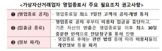 다만 가상화폐 줄폐업에 따른 소비자들의 피해를 최소화하기 위해 거래소는 영업 종료일 이후 최소 30일 전담창구를 통해 예치금과 코인을 출금할 수 있도록 지원해야 한다. 이용자가 기존 코인을 다른 거래소로 이전하는 것도 가능하다.