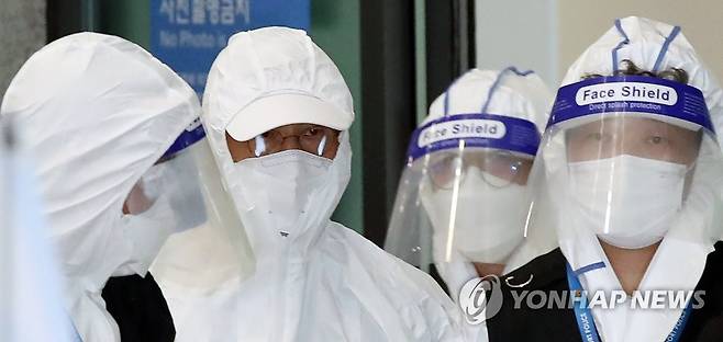 (영종도=연합뉴스) 임헌정 기자 = 광주 철거건물 붕괴 참사 관련 업체선정 과정에 개입한 것으로 드러난 문흥식 전 5·18 구속부상자회장(왼쪽 두번째)이 해외 도피 행각을 마치고 11일 오후 영종도 인천국제공항을 통해 자진귀국한 뒤 경찰에 체포돼 압송되고 있다.