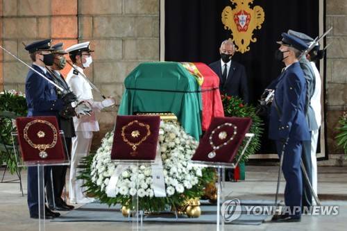 epa09460822 Portuguese President, Marcelo Rebelo de Sousa, pays tribute during the funeral service for the late Portuguese President, Jorge Sampaio, at Belem Palace's Royal Arena, Portugal, 11 September 2021. Jorge Sampaio, former secretary-general of the Socialist Party 'PS' (1989/1992) and two-term President of the Republic (1996/2006), died on 10 September 2021, at the age of 81, at Santa Cruz Hospital, in Lisbon, where he had been hospitalized since 27 August, following respiratory difficulties. EPA/MIGUEL A LOPES