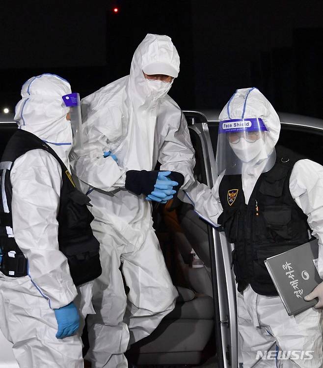 [광주=뉴시스] 변재훈 기자 = 광주 동구 학동 재개발사업 정비 4구역 철거 건물 붕괴 참사를 초래한 불법 재하청 계약 비위 의혹의 중심에 선 문흥식 전 5·18구속부상자회장이 11일 오후 광주 서부경찰서 광역유치장으로 향하고 있다. 문 전 회장은 붕괴 참사 발생 나흘 만에 미국으로 도피해 90일 만인 이날 인천국제공항을 통해 귀국한 뒤 곧바로 체포됐다. 2021.09.11. wisdom21@newsis.com