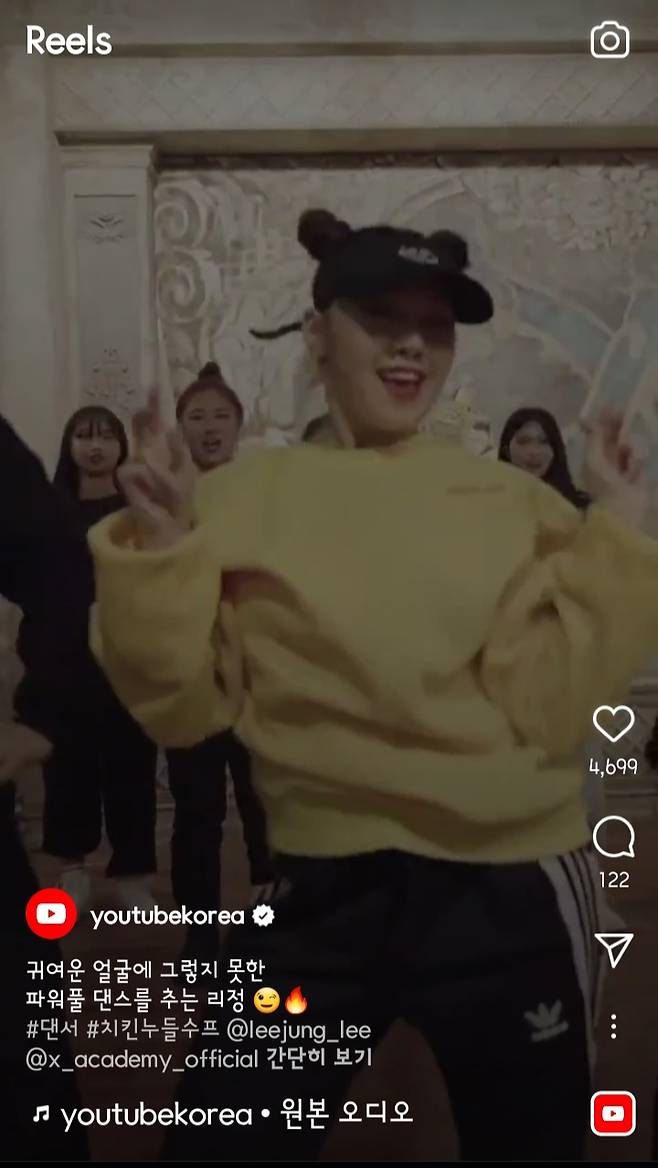 유튜브 코리아는 10일 SNS 인스타그램에 “귀여운 얼굴에 그렇지 못한 파워풀 댄스를 추는 리정” 제목의 영상을 게재했다. 영상에는 리정이 제이홉의 ‘치킨 누들 수프’ 노래에 맞춰 댄스를 선보이는 모습이 담겨있다.