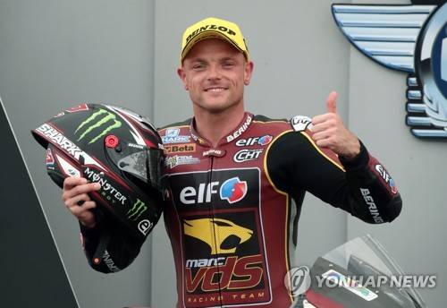 epa09461315 British Moto2 rider Sam Lowes of ELF Marc VDS Racing Team celebrates his pole position after the qualifying for the Motorcycling Grand Prix of Aragon at MotorLand Aragon circuit in Alcaniz, Teruel, northern Spain, 11 September 2021. The Motorcycling Grand Prix of Aragon will be held on 12 September 2021. EPA/JAVIER CEBOLLADA