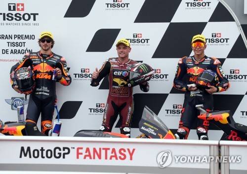 epa09461327 British Moto2 rider Sam Lowes (C) of ELF Marc VDS Racing Team celebrates his pole position with second placed Asutralian Remy Gardner (L) of Red Bull KTM Ajo and third placed Spaniard Raul Fernandez (R) of Red Bull KTM Ajo, after the qualifying for the Motorcycling Grand Prix of Aragon at MotorLand Aragon circuit in Alcaniz, Teruel, northern Spain, 11 September 2021. The Motorcycling Grand Prix of Aragon will be held on 12 September 2021. EPA/JAVIER CEBOLLADA