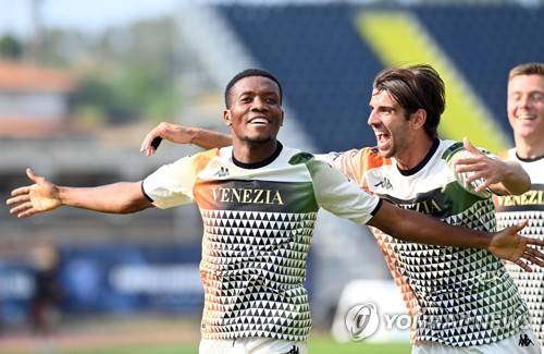 epa09461348 Venezia's David Okereke (L) celebrates after scoring the 2-0 lead during the Italian Serie A soccer match between Empoli FC and Venezia FC at Carlo Castellani Stadium in Empoli, Italy, 11 September 2021. EPA/Claudio Giovannini