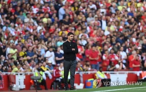 epa09461354 Arsenal manager Mikel Arteta reacts during the English Premier League soccer match between Arsenal FC and Norwich City in London, Britain, 11 September 2021. EPA/NEIL HALL EDITORIAL USE ONLY. No use with unauthorized audio, video, data, fixture lists, club/league logos or 'live' services. Online in-match use limited to 120 images, no video emulation. No use in betting, games or single club/league/player publications