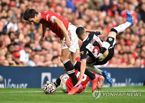 epa09461353 Harry Maguire of Manchester United (L) in action against Miguel Almiron of Newcastle (R) during the English Premier League soccer match between Manchester United and Newcastle United in Manchester, Britain, 11 September 2021. EPA/PETER POWELL EDITORIAL USE ONLY. No use with unauthorized audio, video, data, fixture lists, club/league logos or 'live' services. Online in-match use limited to 120 images, no video emulation. No use in betting, games or single club/league/player publications