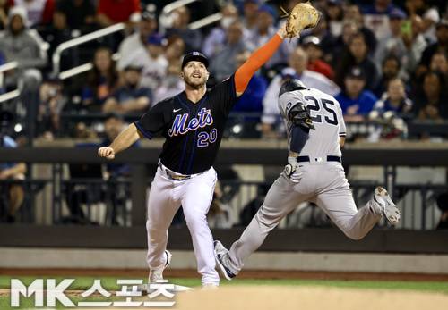 2회초 메츠 수비에서 1루수 피트 알론소가 송구를 받고 있다.