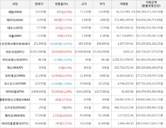 한편 거래금액 기준으로는 세럼, 에이다, 테조스 순으로 가장 활발한 거래를 보이고 있다.
