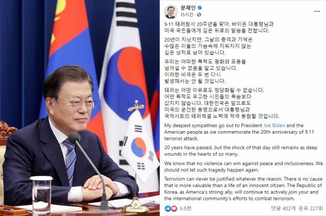 문재인 대통령이 9·11 테러 참사 20주년을 맞아 조 바이든 대통령과 미국 국민에게 위로의 메시지를 보냈다.