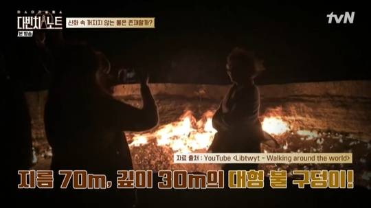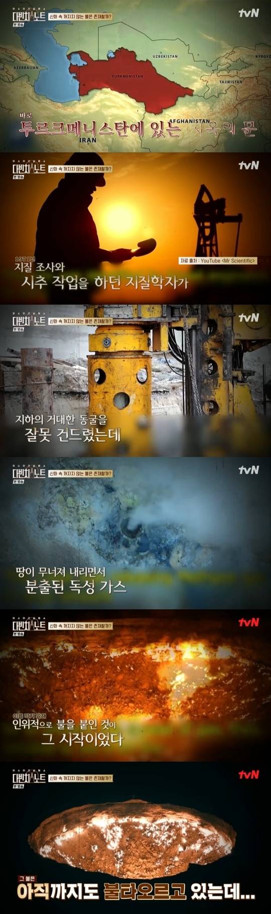이는 1971년 지질시추를 하던 현지 지질학자가 작업 중 지하 거대 동굴을 잘못 건드리는 바람에 생긴 것으로 알려져 충격을 줬다. 땅이 무너져 내리며 독성 가스가 분출됐고, 이로 인한 환경 오염을 막기 위해 인위적으로 불을 붙이며 지옥의 문이 열렸다는 것. 금방 꺼질 것이라 여겨졌던 해당 불은 지금까지도 불타오르고 있다고 전해졌다. (사진=tvN '미스터리 실험쇼 다빈치노트' 캡처)