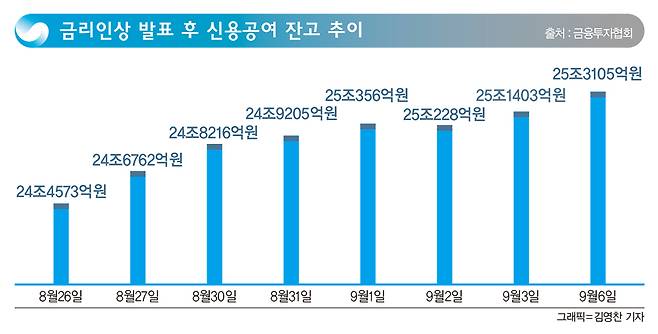 금리 인상에 따른 이자 부담 증가에도 증권사로부터 돈을 빌려 투자한 규모는 오히려 확대된 모습이다. 금융투자협회에 따르면 지난 3일 기준 신용거래융자 잔고는 25조1403억원으로 집계됐다. 이는 전일대비 1175억원, 한은의 기준금리 인상 결정 이후론 6830억원 각각 증가한 규모다. 8월 중순 25조원을 돌파한 이후 같은 달 말까지 24조원대로 줄었던 신용거래융자는 9월 들어 다시 25조원을 넘긴 후 상승세를 유지하고 있다. 기준금리 인상에 따른 이자 부담으로 신용융자가 줄어들 것이란 전망과는 정반대의 모습이다.