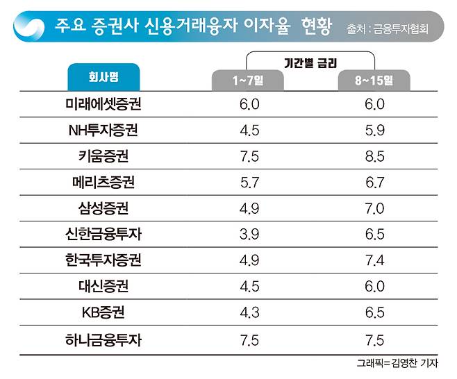 금융투자협회가 공시한 신용거래융자 이자율은 증권사와 기간별로 차이를 보인다. 융자기간이 7일 이내인 경우 증권사별 신용거래융자 금리는 최저 3.9%에서 최고 7.5%까지로 은행의 대출금리보다 높은 편이다. 금리 인상이 본격화할 경우 증권가 신용융자 평균 금리는 더 오를 것으로 업계는 예상하고 있다. 증권사 대출은 은행의 ‘중금리 대출’보다 금리가 높고 상환기한도 짧아 소폭의 금리 인상으로도 빚투족의 이자 부담이 빠르게 커진다.