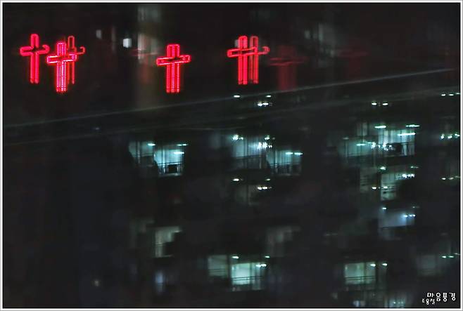 「 동네 고깃집에서 아내와 술 한잔하다가 다중 창에 비친 십자가를 보았다. 스마트폰 야간 모드로 촬영했다. 삼성 갤럭시 s21 울트라.