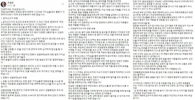“(한 부장이) 공익신고자 보호를 위해 권익위를 제안했지만 스스로 ‘신변보호는 두 번째, 이 자료가 해당 수사기관이 직접 인지하지 않고 제3의 기관들에서 떠돌아다니길 원치 않는다’고 했다”고 한 조 전 부위원장은 “지난 8일 김웅 및 윤 전 총장의 기자회견 이전에는 제출한 자료들의 포렌식 등 절차가 마치는 것을 마무리로 일상에 돌아가고자 했다”고 설명했다.