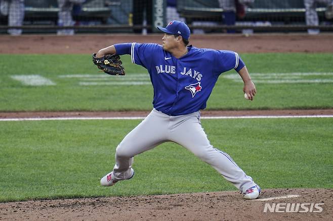 [볼티모어=AP/뉴시스] 토론토 블루제이스의 류현진이 11일(현지시간) 미 메릴랜드주 볼티모어의 오리올파크 앳 캠든야즈에서 열린 2021 메이저리그(MLB) 볼티모어 오리올스와의 연속경기 1차전에 선발 등판해 3회 투구하고 있다. 류현진은 2⅓이닝 8피안타(2피홈런) 1볼넷 4탈삼진 7실점의 최악투를 기록하며 강판당했고 팀이 7회 역전하면서 패전은 면했다. 2021.09.12.