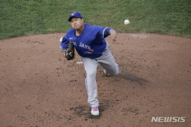 [볼티모어=AP/뉴시스] 토론토 블루제이스의 류현진이 11일(현지시간) 미 메릴랜드주 볼티모어의 오리올파크 앳 캠든야즈에서 열린 2021 메이저리그(MLB) 볼티모어 오리올스와의 연속경기 1차전에 선발 등판해 1회 투구하고 있다. 류현진은 2⅓이닝 8피안타(2피홈런) 1볼넷 4탈삼진 7실점의 최악투를 기록하며 강판당했고 팀이 7회 역전하면서 패전은 면했다. 2021.09.12.