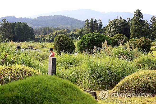 (제주=연합뉴스) 박지호 기자 = 추석 연휴를 일주일 남짓 앞둔 12일 오전 제주시 서부공설묘지를 찾은 시민들이 벌초하고 있다. 2021.9.12