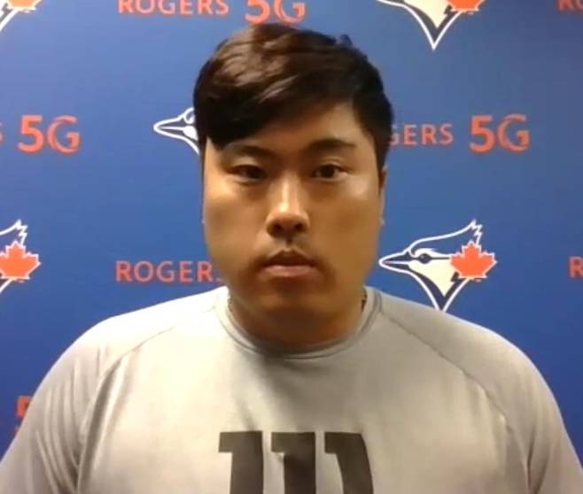 (서울=연합뉴스) 토론토 블루제이스 류현진이 12일 미국 메릴랜드주 볼티모어 오리올 파크 앳 캠든야즈에서 열린 미국프로야구 메이저리그(MLB) 볼티모어 오리올스와 원정경기 더블헤더 1차전을 마치고 화상 인터뷰하고 있다. 2021.9.12 [MLB 화상 인터뷰 제공. 재판매 및 DB 금지]