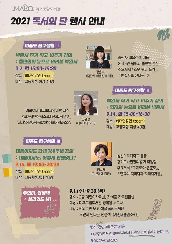 강연은 '줌' 프로그램으로 진행되며 마포중앙도서관 홈페이지에서 고등학생 이상 40명을 대상으로 신청을 접수 중이다.