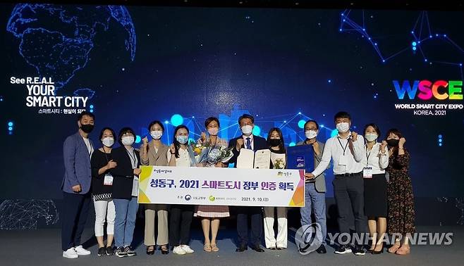 (서울=연합뉴스) 서울 성동구가 국토교통부 '스마트도시 인증' 공모에서 우수 스마트도시로 선정됐다고 12일 밝혔다. 사진은 기념식에 참석한 유보화 부구청장(오른쪽 여섯 번째)과 직원들. 2021.9.12