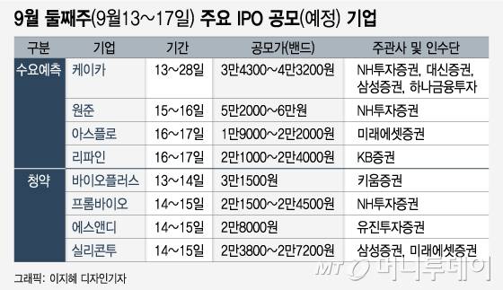 국내 최대 직영중고차 플랫폼인 케이카, 건강기능식품 업체 프롬바이오, 첨단소재 열처리 솔루션 업체 원준, 화장품 이커머스 플랫폼 실리콘투 등이 수요예측에 나선다.