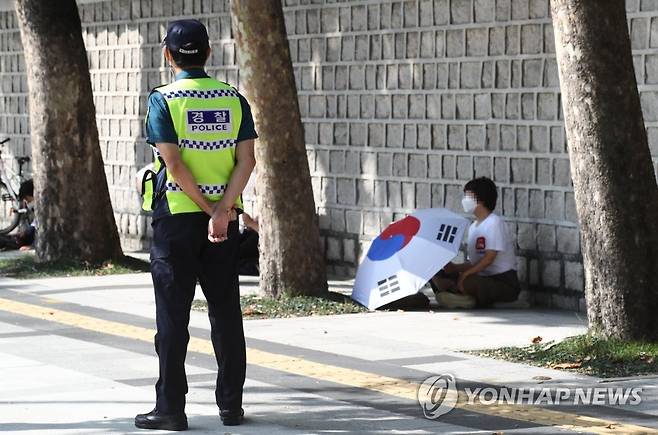 (서울=연합뉴스) 이재희 기자 = 관할 구청으로부터 시설 폐쇄 결정을 받은 서울 성북구 사랑제일교회의 신자들이 12일 오전 서울 광화문 인근 인도에서 현장 예배를 하고 있다. 2021.9.12