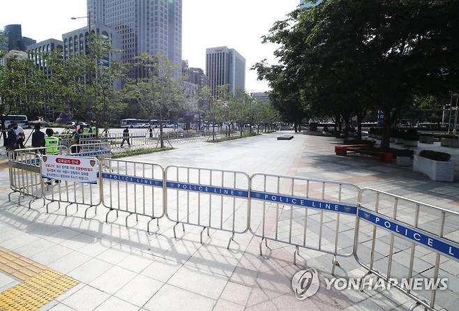 (서울=연합뉴스) 이재희 기자 = 12일 오전 서울 광화문 동화면세점 앞 광장에 펜스가 세워져 있다. 서울 성북구 사랑제일교회가 관할 구청으로부터 시설 폐쇄 처분을 받은 뒤 교인들이 이곳에서 비대면 예배를 진행하자 경찰이 코로나19 확산 방지를 이유로 펜스를 설치했다. 2021.9.12