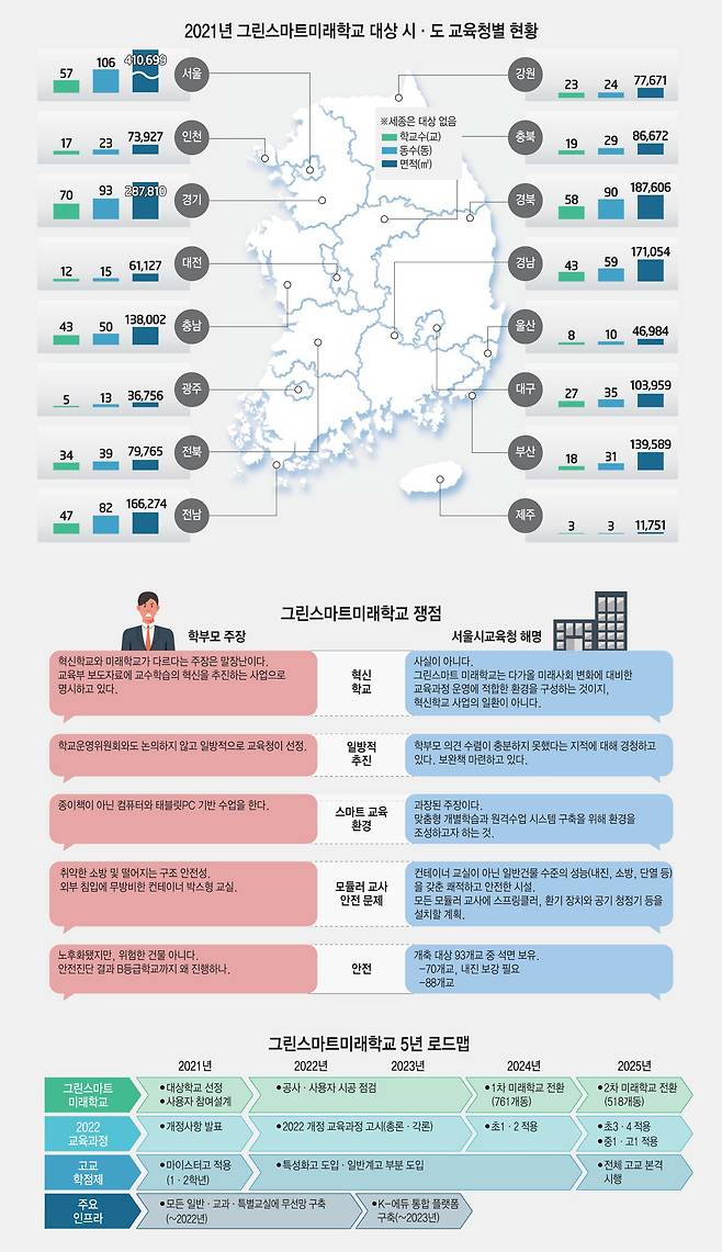 그린스마트미래학교는 5년 동안 18조5000억원을 투입해 40년 이상 노후화된 학교 건물을 개축하거나 리모델링하는 사업이다. 탄소중립을 실현할 수 있는 친환경 요소로 건물을 고치고 클라우드·인공지능(AI) 등 첨단기술을 수업에서 활용할 수 있도록 스마트 교육환경까지 구축하는 사업이다. 토론식 수업에 편리하도록 일부 교실은 배치도 바꾸고, 고교학점제 등 교육제도 변화에 맞춰 교실을 늘리고 강의 이동에 편리하게 복도도 넓히는 변화도 준다. 정부가 학교 환경을 개선해준다는 소식에 지역에 따라서는 국회의원들까지 유치 작업에 나서기도 했다.