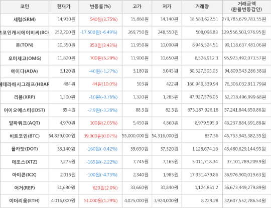 한편 거래금액 기준으로는 세럼, 비트코인캐시에이비씨, 톤 순으로 가장 활발한 거래를 보이고 있다.