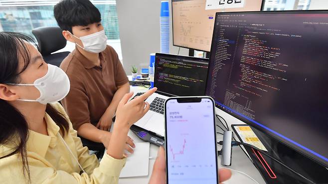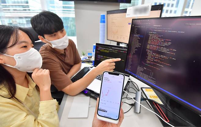 국내 주식의 소수점 단위 거래가 전격 도입된다. 서울 강남구 토스증권에서 개발자들이 소수점 단위 거래 서비스 제공 관련 논의를 하고 있다.