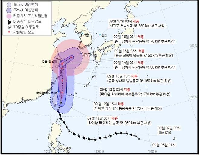 기상청은 브리핑을 통해 "상하이 부근에서는 시속 5㎞ 정도로 매우 느리게 움직이는 정체 상태를 보이다가 15~16일 동쪽으로 움직여 제주도 부근 남해상이나 남해안으로 이동할 것으로 보인다"고 밝혔습니다.