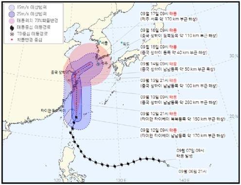 태풍은 13∼15일 중국 상하이 부근에서 약 3일간 시속 5㎞ 내외로 정체하다가 15∼16일 동쪽으로 이동해 제주도 부근 남해상이나 남해안으로 다가 올 가능성이 크다.