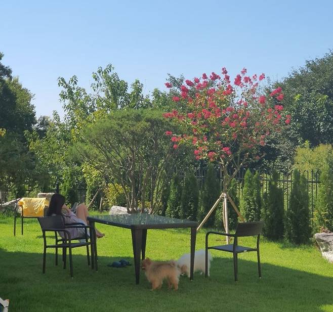공개된 사진 속 박성광 아내 이솔이는 으리으리한 집 마당에서 햇살을 즐기고 있다. 반려견 두 마리, 아내와 함께 드넓은 집에서 보내는 여유로운 주말이 부러움을 자아낸다.