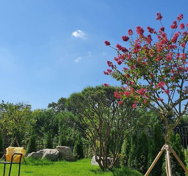 공개된 사진 속 박성광 아내 이솔이는 으리으리한 집 마당에서 햇살을 즐기고 있다.