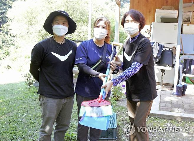 (서울=연합뉴스) 한정애 환경부 장관(오른쪽)이 12일 오전 강원도 화천군에 위치한 곰 사육 농가를 방문해 사육 곰을 보호 중인 '동물권행동 카라'와 '곰보금자리프로젝트' 관계자에게 청소도구를 전달하며 사육 곰 보호 활동에 감사를 전하고 있다. 2021.9.12