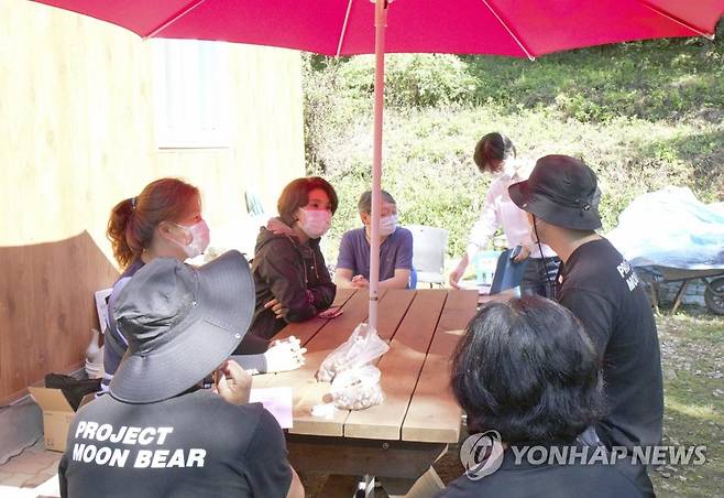 (서울=연합뉴스) 한정애 환경부 장관이 12일 오전 강원도 화천군에 위치한 곰 사육 농가를 방문해 사육 곰을 보호 중인 '동물권행동 카라'와 '곰보금자리프로젝트' 관계자로부터 보호 현황에 대한 설명을 듣고 있다. 2021.9.12