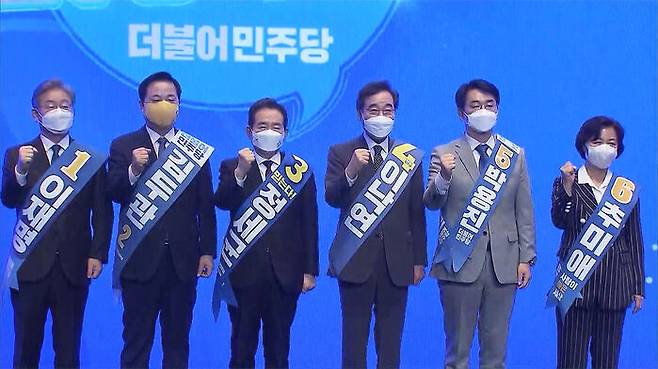 이재명·김두관·정세균·이낙연·박용진·추미애(기호순) 민주당 경선 후보 6명은 오늘(12일) 오후 3시 반부터 강원 원주 오크밸리리조트 컨벤션홀에 합동연설을 하고 있습니다.