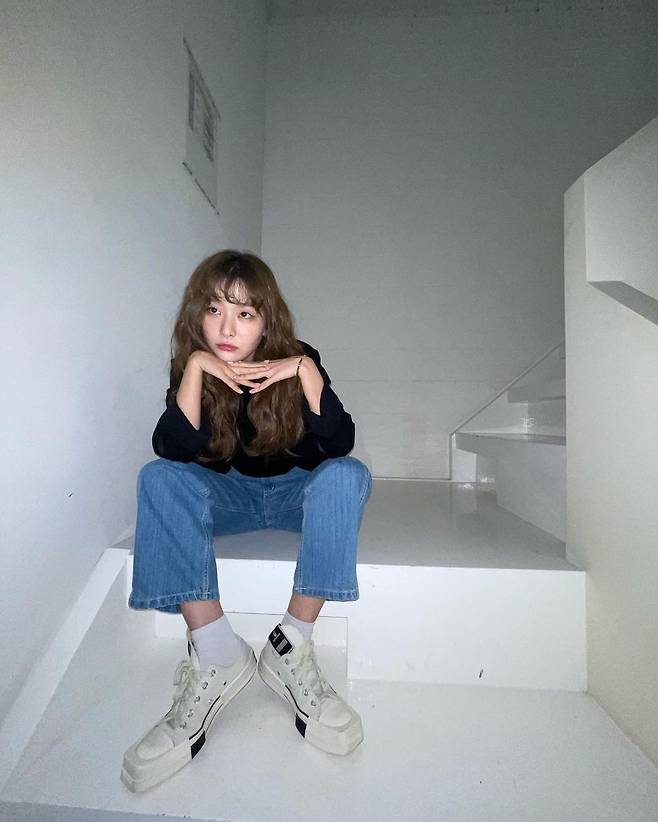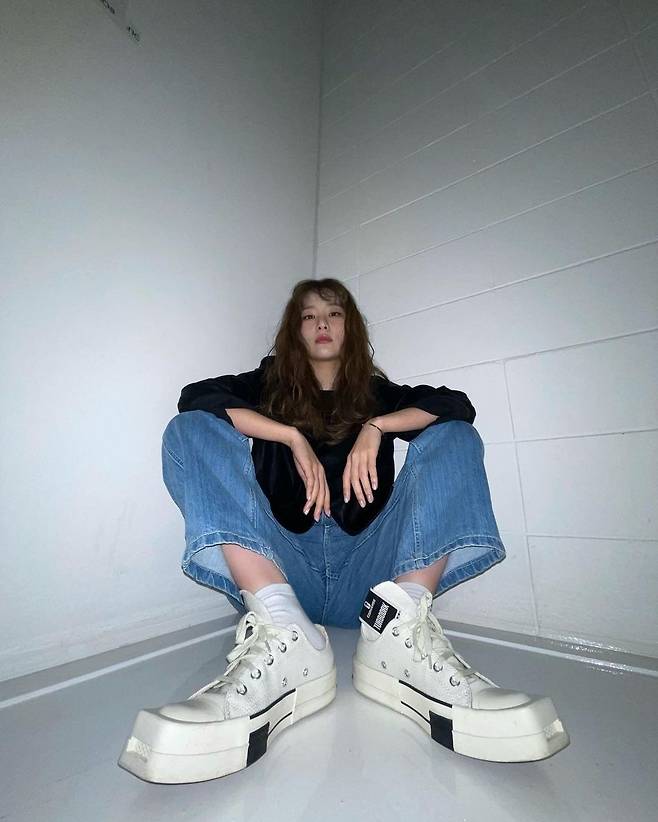 공개된 사진 속 슬기는 앞솔이 각진 독특한 디자인의 운동화를 신은 모습. 여기에 아래에서 위를 향해 찍은 재미난 사진 구도로 넘사벽 비율을 완성했다.