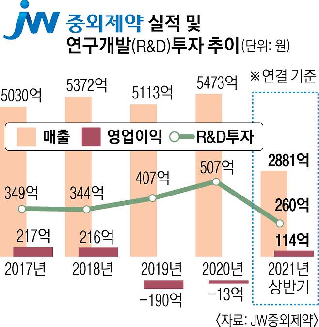 한편 JW중외제약은 올해 상반기 매출 2881억원, 영업이익 114억원을 기록하며 흑자 전환에 성공했다. 올해를 ‘R&D 중심 경영의 원년’으로 선포한 JW중외제약은 올해 R&D 투자 비율을 매출액의 10%로 끌어올린다는 방침이다. JW중외제약의 지난해 매출 대비 R&D 투자 비율은 9.26%(507억원), 올해 상반기는 9.02%(260억원)였다.