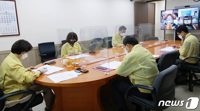 (서울=뉴스1) = 유은혜 사회부총리 겸 교육부 장관이 12일 오후 서울 종로구 정부서울청사에서 질병관리청과의 영상회의를 갖고 하반기의 안전한 등교수업을 위한 학교의 역학조사 체계보완 및 소아청소년 백신접종 안정성 등 백신접종방안 등을 논의하고 있다. (교육부 제공) 2021.9.12/뉴스1