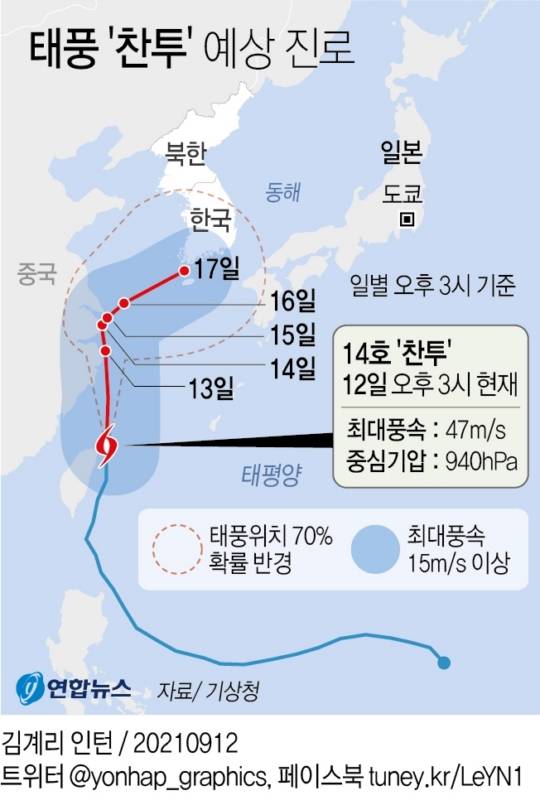 기상청에 따르면 찬투는 이날 오후 3시 현재 중심기압 940헥토파스칼(hPa)에 최대 풍속 초속 47m인 매우 강한 태풍으로, 타이완 타이베이 동북동쪽 80㎞ 해상에서 시속 22㎞ 속도로 북진하고 있다.