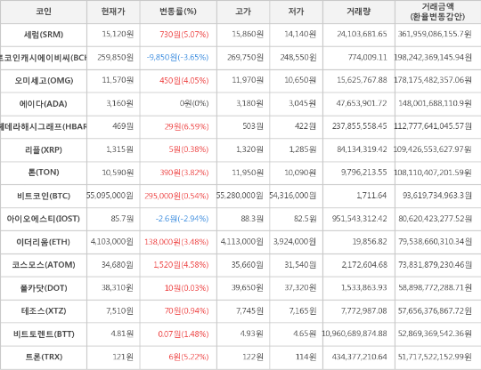 또한, 트론(5.22%, 121원), 세럼(5.07%, 15,120원), 코스모스(4.58%, 34,680원), 오미세고(4.05%, 11,570원), 톤(3.82%, 10,590원), 이더리움(3.48%, 4,103,000원), 비트토렌트(1.48%, 4.81원), 테조스(0.94%, 7,510원), 리플(0.38%, 1,315원), 폴카닷(0.03%, 38,310원)이 상승세를 나타냈다.