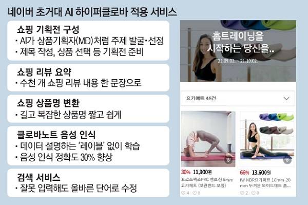 네이버쇼핑 온라인 기획전이 대표적이다. 요가매트 기획전의 경우 '홈트레이닝을 시작하는 당신을 위해'라는 마케팅 문구가 달리고, 미끄럼방지·충격흡수·무소음 등 다양한 특징을 내세운 상품 48개가 일목요연하게 배치됐다. 흠잡을 데 없어 보이는 이 기획전은 상품기획자(MD)의 작품이 아니다. 하이퍼클로바를 적용한 AI가 네이버 쇼핑 검색과 상품 데이터를 분석해 기획전 주제 선정부터 제목 작성, 상품 구성까지 모든 과정을 알아서 진행했다. 네이버 관계자는 "AI 기획전은 사람이 준비한 것보다 클릭 수가 더 많이 나오고 구매전환율이 30%포인트 더 높다"며 "상품도 더 골고루 판매된다"고 말했다.