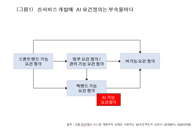 (지디넷코리아=심기보 전 정보통신기술사협회장)신(新)서비스 개발에 AI를 활용하는 사례(케이스)가 증가하고 있다. AI기능 요건정의가 통상의 시스템 개발과 다른 점은 '학습한다'는 요소가 있다는 점이다. 신 서비스 개발 AI 프로젝트 요건정의 중 AI 기능 요건정의의 구체적인 작업 내용은 그림1과 같다.