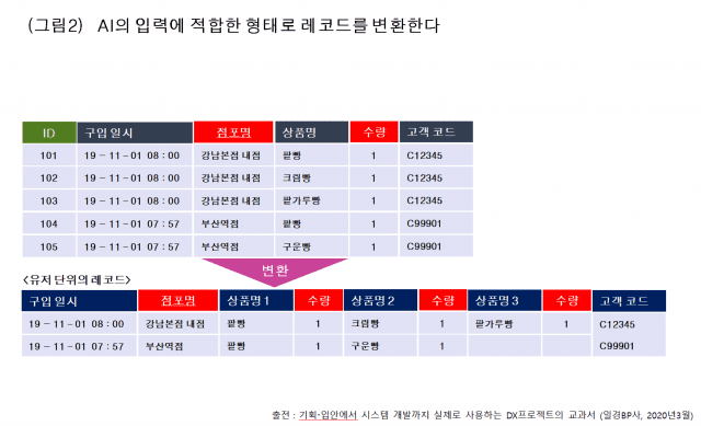 인풋이 정해지면 다음은 처리 요건정의를 시행한다. 즉, 인풋 데이터를 만들기 위한 전 처리 요건을 정한다. 전 처리는 원 데이터를 가공해 AI에 입력할 수 있는 데이터로 만드는 것이다. 이번 회에서는 서비스 이용자별로 그 이용자에게 최적의 빵을 추천하기 위한 학습 모델에 구입 이력을 입력한다. 만약 POS 데이터가 상품 단위로 보존되어 있는 경우, 이것을 이용자 단위로 변환하는 처리가 그림2처럼 필요하게 된다.