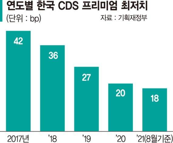 한국의 CDS 프리미엄이 10bp대로 내려온 것은 2008년 금융위기 이후 처음이다.한국의 CDS 프리미엄은 2014~2017년까지 39~83bp 사이에서 움직였지만 2017년 하반기부터 개선 흐름을 보였다. 지난해 3월 코로나19 팬데믹 영향으로 57bp까지 상승했지만 이후 빠르게 안정돼 올해 1분기에는 22~25bp 수준을 유지했다.